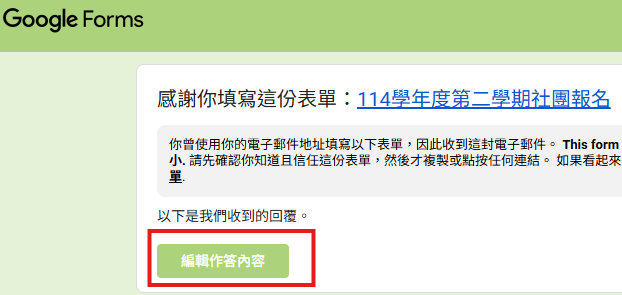 ★ 填完之後會收到回覆信件,如果想要修改,直到報名截止表單關閉前,都可以再進到填表單時所留下的電子郵件信箱裡點選〝編輯內容〞去做更改,不需要再重新填寫報名(附件裡有說明)。