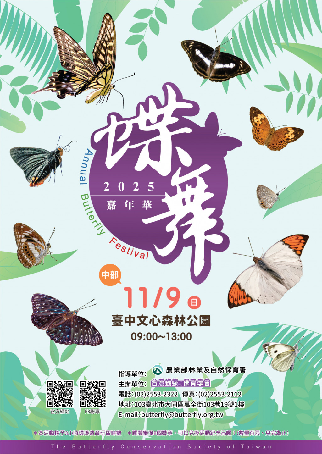 114年11月09日於文心森林公園(捷運站出口旁)舉行「2025 蝶舞嘉年華」大型環境教育推廣活動,公文附件為文宣海 報,敬請張貼公告週知並鼓勵老師和學生踴躍參加。